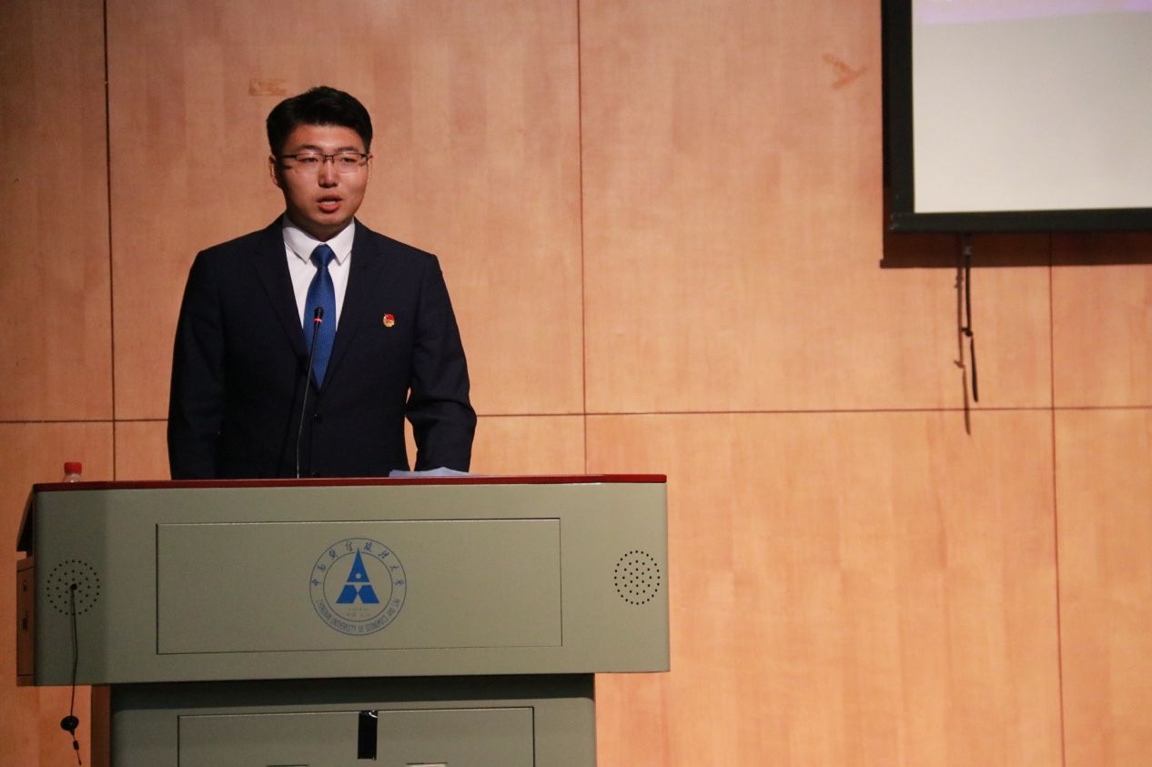 团歌奏唱完毕后,bat365在线平台官网学员杨益作为bat365在线平台官网青马班学员代表以“牢记青春使命 勇担时代重任”为主题进行演讲。他以祖国七十周年华诞、五四运动一百周年为切入点,从党的领导、追寻中国梦、扎根人民、永久奋斗几方面进行阐述,指出了作为新时代青年应有的思想感悟和百年历史对当代中国青年的深远影响,引起了在场学员的共鸣。紧接着由财政税务学院学员代表进行主题演讲,他首先以平常生活中的对白为切入点,提出当代新青年与国家之间的关系,而后旁征博引,以四大名著之一的《西游记》作比联系现代人民社会国家,展现了中国特色社会主义未来发展的蓝图。