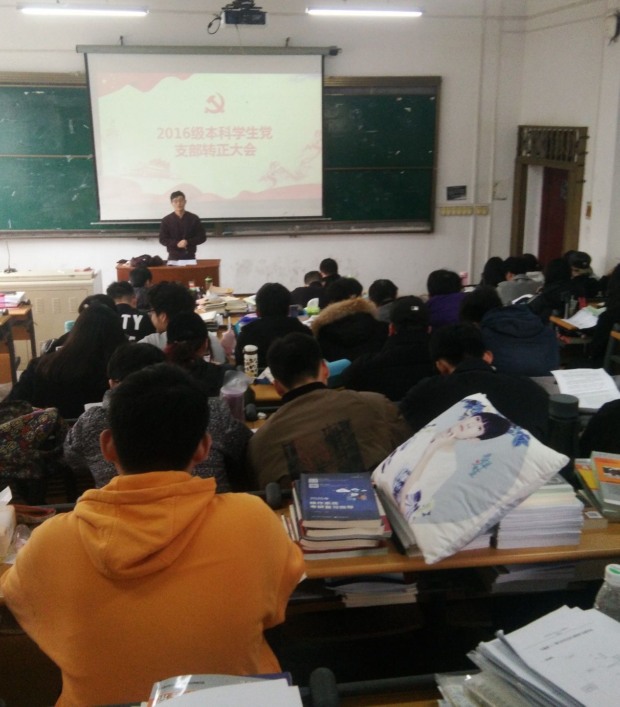 2019年12月23日上午10:00, bat365官网2016级本科学生党支部预备党员转正会议在电教楼201召开。2016级本科学生党支部全体党员参加会议,会议由党支部书记卓张鹏老师主持。