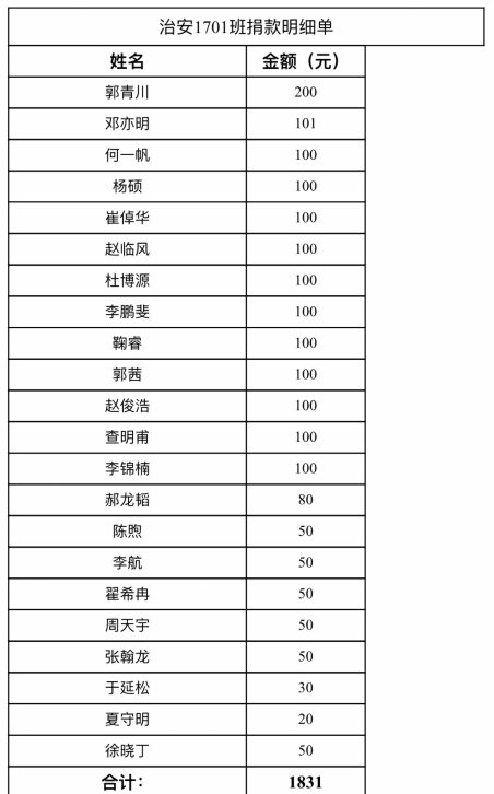 4月4日清明节,治安1701班举行线上集体默哀仪式,哀悼抗击新冠肺炎斗争牺牲烈士和逝世同胞。随后,班长何一帆在班群里提出倡议,购买一批爱心物资捐赠给抗疫一线的单位,同学们自发捐款,不到半天,便筹到善款1831元,预订了一批饮品和草莓。