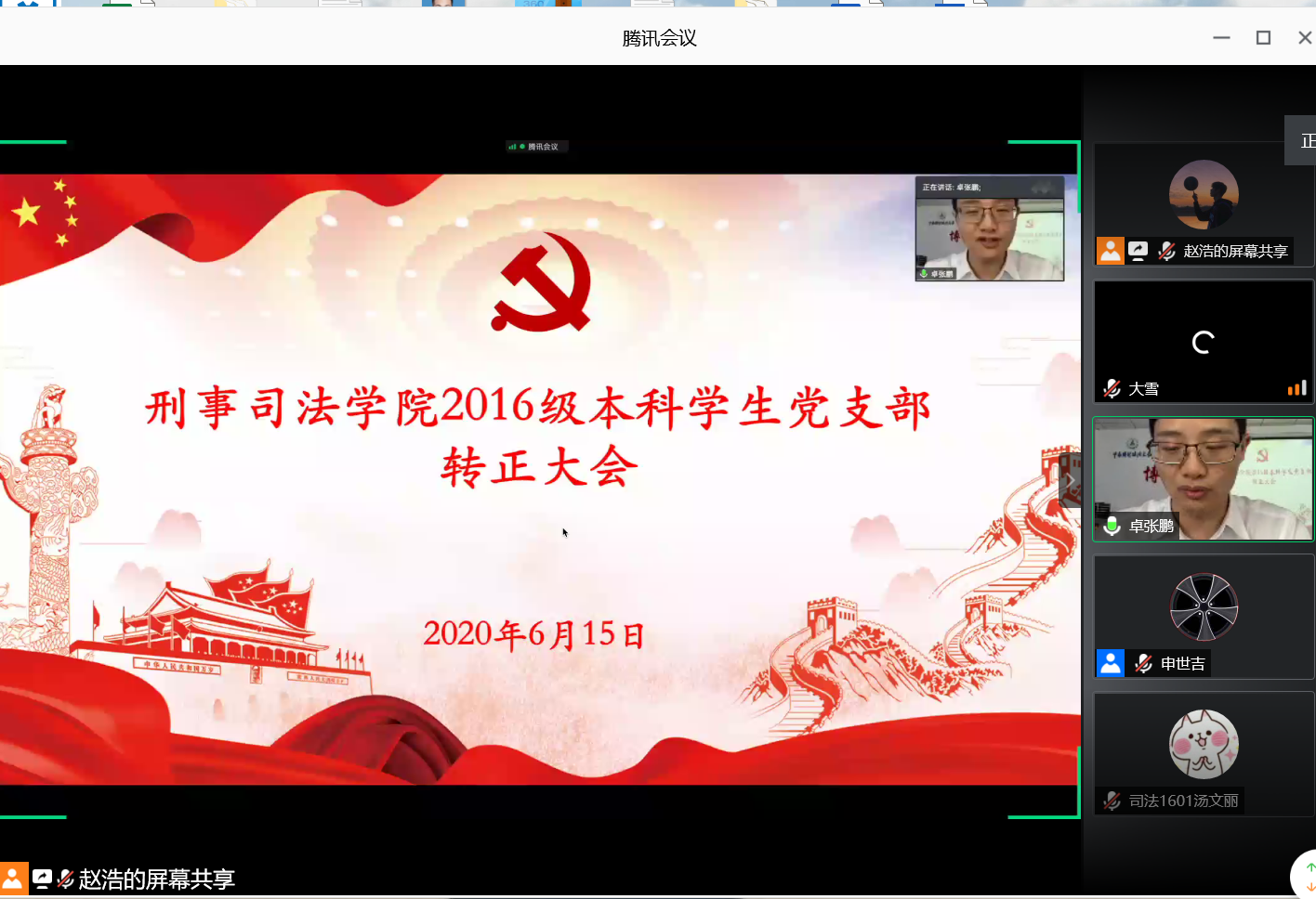 (通讯员 申世吉)6月15日下午3:00, bat365官网2016级本科学生党支部预备党员转正会议在文治楼二楼会议室以“线上+线下”相结合的方式召开。bat365在线平台官网党委副书记万里雪、党政办主任刘宇、辅导员黄文菊、郭青川以及2016级本科学生党支部全体党员参加会议,会议由党支部书记卓张鹏老师主持。
