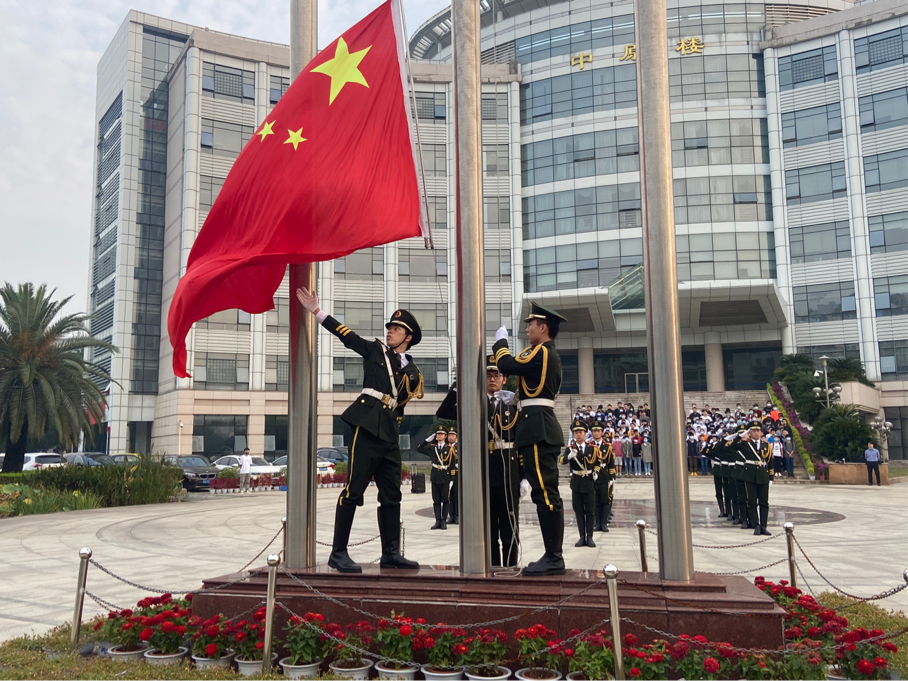 金秋和煦凉爽的微风轻轻吹拂,天空湛蓝而明亮。早上六时五十五分,我校国旗护卫队准时从文治楼列队出发,于七时五分到达青云桥。他们昂首挺胸,步伐矫健,飒爽的英姿吸引了众多师生的目光。队伍到达国旗台后,在口令员的指挥下,分列于升旗台两侧。国歌在中南楼前的广场上庄严响起,随着一声“敬礼”,国旗在观礼师生们的注视下缓缓升起。观礼师生行注目礼,全场肃穆。