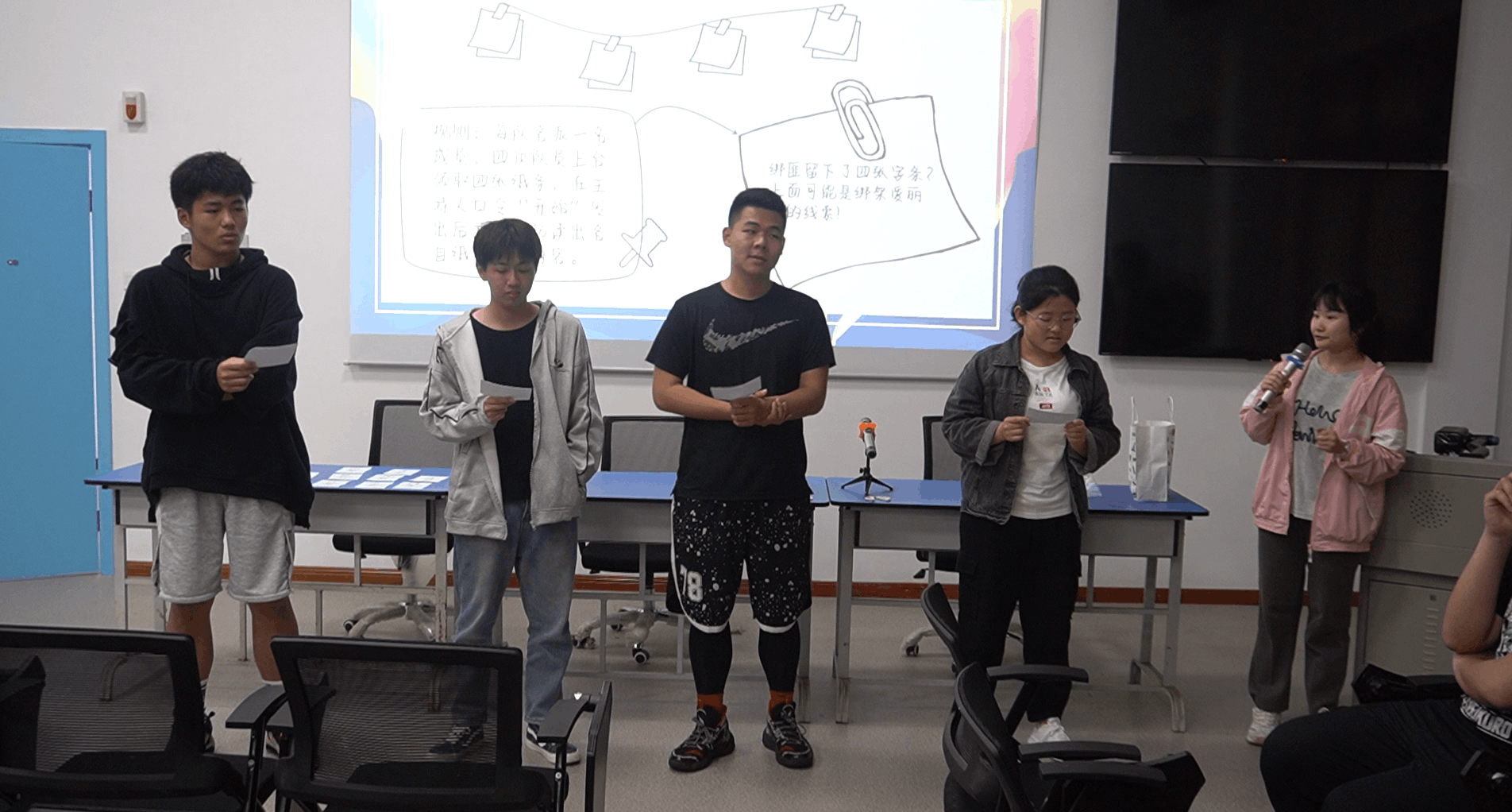 挑战环节“驿站传书”是最具趣味性的环节。在设定的剧情中,房间号的信息需要根据绘画来提示。规则为四列最后一排同学分别将各自得到的信息通过绘画的形式向前面的同学传递,以此类推,直至第一排同学接收到绘画信息为止。挑战进行的过程中,第一个小组的“麦克风”信息在后半列同学的笔下还是话筒的形象,可是到了第一排却变成了一栋楼,令全体同学忍俊不禁,啼笑皆非。过程虽有曲折,但通过大家的努力,最后还是得出了正确的房间号“0423”。这个环节令同学们思考了聚焦沟通、集中注意力的重要性。
