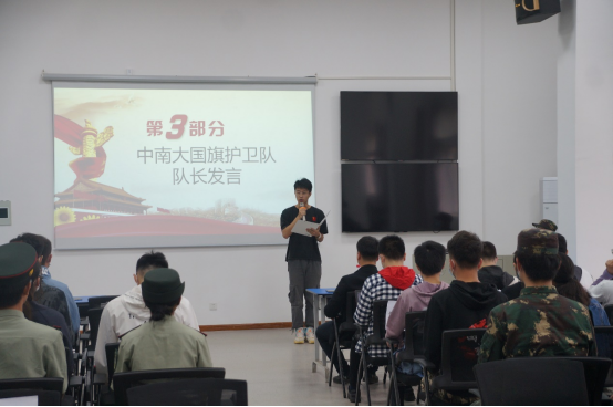 大会进行第五项,各高校国旗护卫队进行各种形式的展示交流。首先由中国地质大学国旗班带来发展成果展示与经验分享。中国地质大学国旗班的战友介绍了组织构成,下设宣传组、秘书处、作训组、志愿服务组。其中,志愿服务活动的成功开展给各兄弟院校提供了一个优秀样本与成功范例。最后,地大国旗班的战友表示将爱旗、护旗的精神传承下去,愿与兄弟院校一同展望未来。之后,中南大国旗护卫队宣讲团团长孔汝健进行了队伍主要成果的介绍和展示。总共分为队伍简介、科室安排、训练管理、风采展示、未来展望这五个部分,展示了队伍风采,也阐明了中南大国旗护卫队的未来构想。