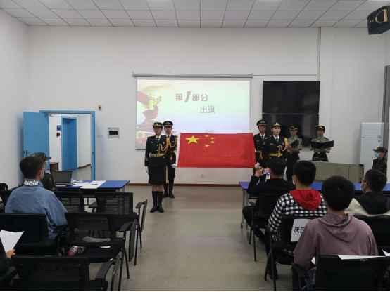 大会第一项,由我校国旗护卫队代表出旗,全体起立奏唱国歌。队员们以整齐划一、铿锵有力的步伐完成了出旗,全体与会人员迅速起立奏唱国歌,整个会场庄严肃穆。在这面鲜红旗帜的引领下,各兄弟院校战友的赤子之心紧紧联系在一起。望向五星红旗的如炬目光里,闪烁的是使命,更是信仰。