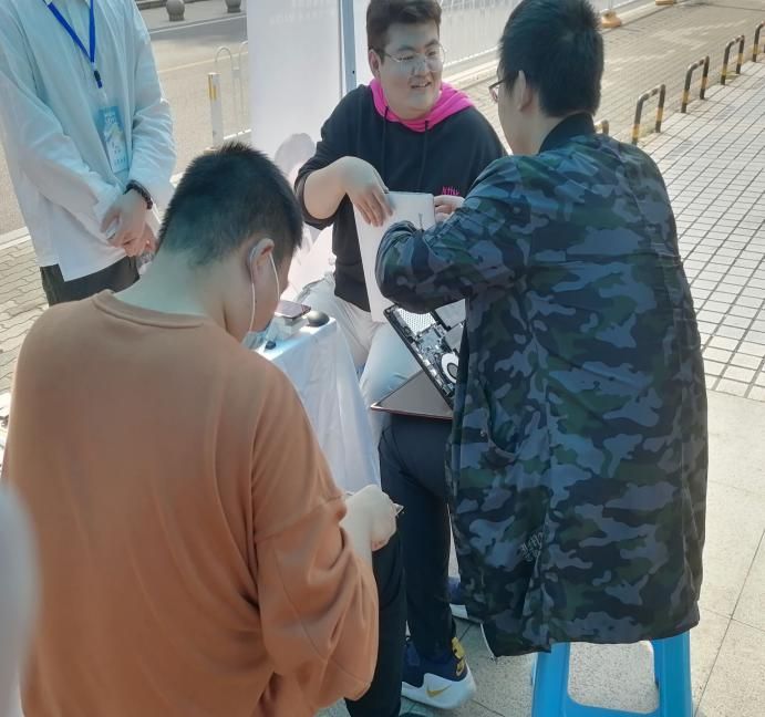 活动进行时,志愿者给往来同学分发传单、详细讲解活动内容,做现场引导,值班志愿者配合相关技术人员按照疑难解答、电脑检修、信息登记的流程引导参与者有序参与电脑义诊。大家各司其职,尽心尽力。