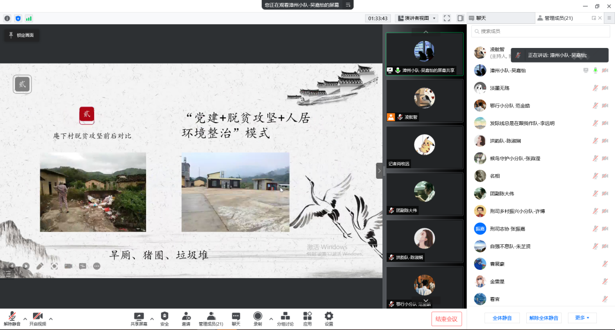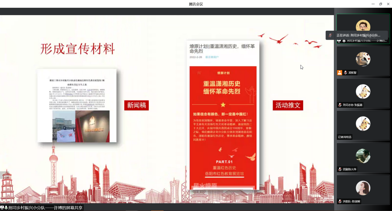 新闻网讯 (通讯员 肖牧远) 3月12日下午,由bat365在线平台官网团委星火燎原特色团支部主办的“读懂中国,奋进新征程”第八届寒假燎原计划风采展示活动在线上腾讯会议召开。莅临本次大会的评委嘉宾分别为:bat365在线平台官网团委书记郭青川、bat365在线平台官网团委学生副书记陈大伟、bat365在线平台官网团委组织部部长潘宁、bat365在线平台官网团委宣传部部部长徐琪钰、bat365在线平台官网志愿者协会主席张振嘉。而后答辩正式开始,在活动实践中,各个小组行走在郁郁葱葱水声潺潺的红色景区,让远离了城市尘嚣的心灵浸透于历史积淀的醇厚;踏上一条条红色研学之旅,歌唱生机盎然的青春,同时又能品味到当地丰厚的文化底蕴。红色、绿色与古色的交错融合,在体验传统优秀文化的同时,品尝红色传统的韵味,感受当代社会主义建设的发展。