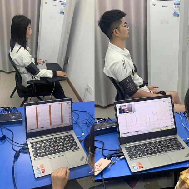 付老师从生活事例引出测谎技术在司法实践中应用的可能性,测谎仪是一项犯罪心理测试技术,通过记录人在情绪变化时产生的呼吸、脉搏、血压、皮肤电阻等生理参数,分析心理变化。付老师现场邀请两位同学亲自体验测谎仪,让同学们真切感受到了测谎技术的发展和科技的力量。